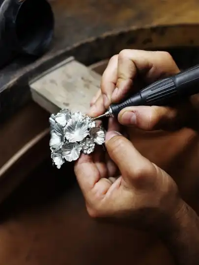 “Look at the details on this,” says Caroline Gauthier, the creative director of Goossens, holding up a golden hydrangea leaf, its delicate veins just visible in the workshop’s stark light. Moulded from a real plant, the challenge was to capture the leaf’s fine details in brass – the main material used to craft Goossens’ jewellery collections. This is then dipped in 24-carat gold to create a delicate replica.