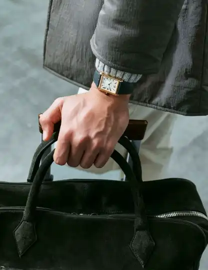 Jacket byHevò, jumper bySebago, trousers byIncotex, Tank Louis Watch byCartier, bag byMétier, suitcase byRimowa