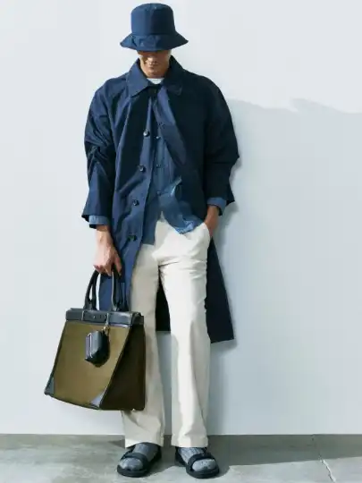 Coat byDrei BergefromA Young Hiker, trousers byLoro Piana, shoes byJohn Lobb, seamaster railmaster watch byOmega, umbrella byMaehara Kouei ShoutenxPorter, bag byMontblanc