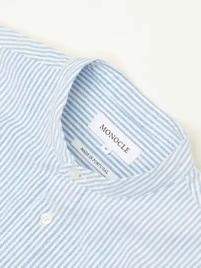 The Monocle summer camp-collar shirt is is washed to create a crinkled texture and a soft, timeworn feel, and it fastens with mother-of-pearl buttons. Made from organic cotton woven in Japan, this breathable style layers effortlessly for hot summer days.