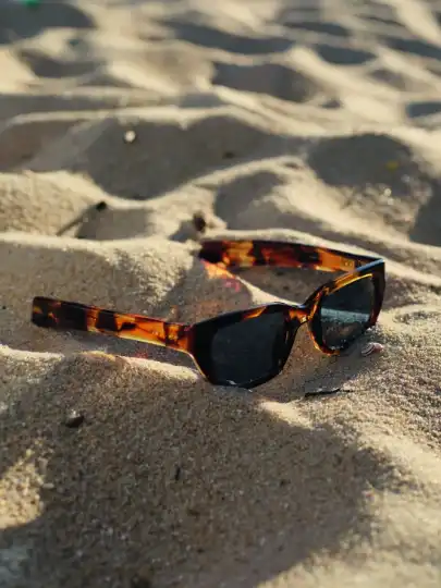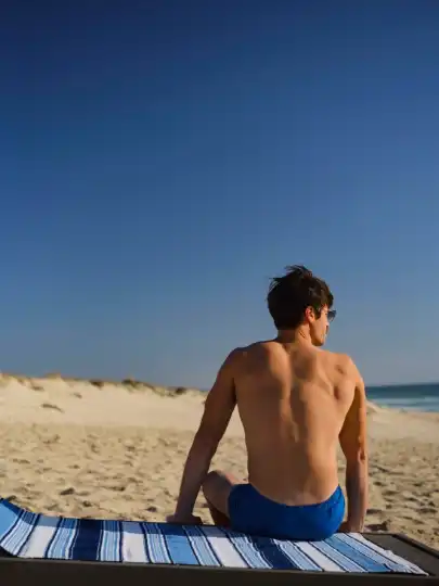 Swim shorts byPier Sicilia, beach mat byOriginal Madras Trading Company, sunglasses byLindberg