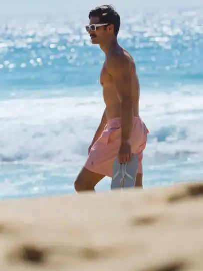 Swim shorts byPolo Ralph Lauren, sunglasses byGucci, flip flops byHavaianas
