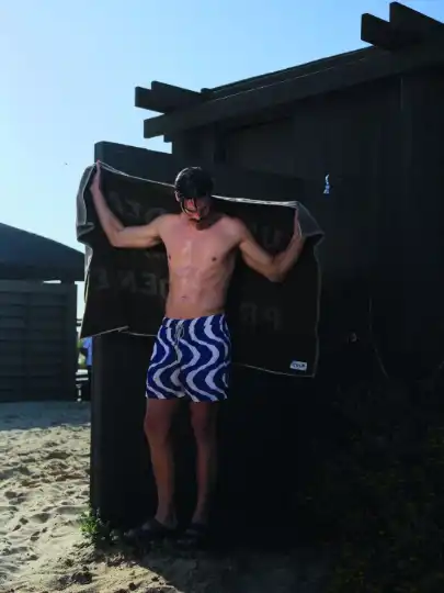Swim shorts byOAS, sandals byBirkenstock, beach towel byCDLP