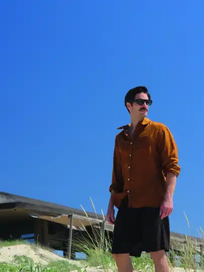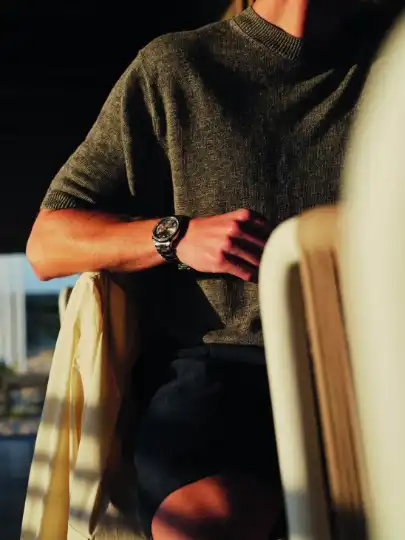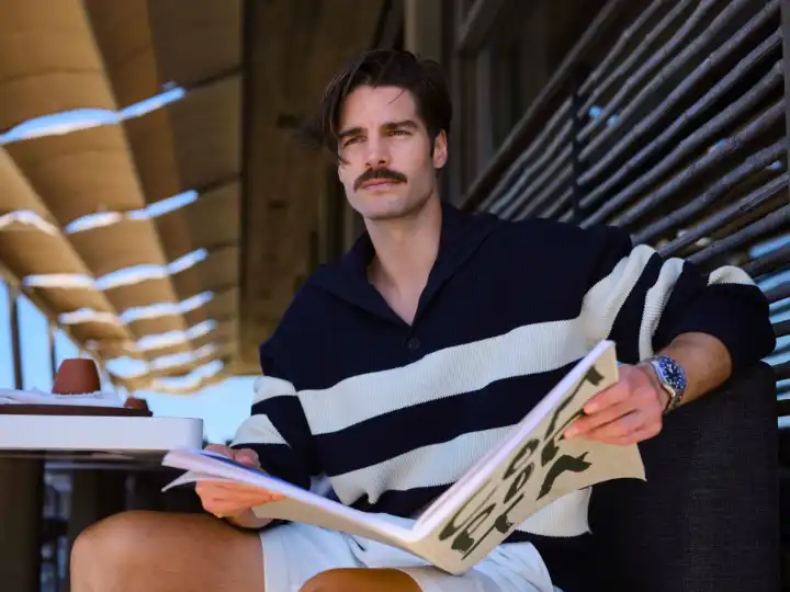 Jacket byValstar, jumper byBatonerfromTrunk, shorts byArpenteur, Le Club Sport Worldtimer watch byNomos Glashütte