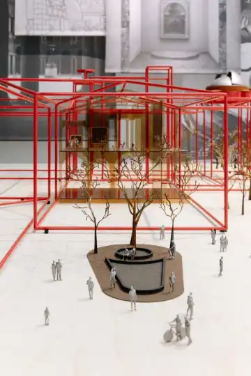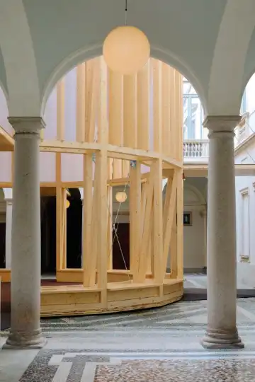 A Cucinella-designed wooden temple structure, donated to the museum by Salone del Mobile, sits inside an inner courtyard alongside various artistic masterpieces. This courtyard, inspired by a temple in Raphael’s painting “The Marriage of the Virgin”, will eventually be covered by a glass roof. Cucinella says that the aim was to create something contemporary, while also referencing history. It acts as both a functional gathering space and a symbolic meeting point at the heart of the wider Grande Brera complex. “It has become the image of the palazzo,” he says.