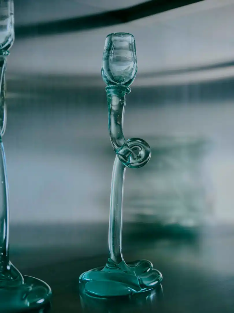 Recycled glass candlestick featuring Jewsbury’s signature swirls