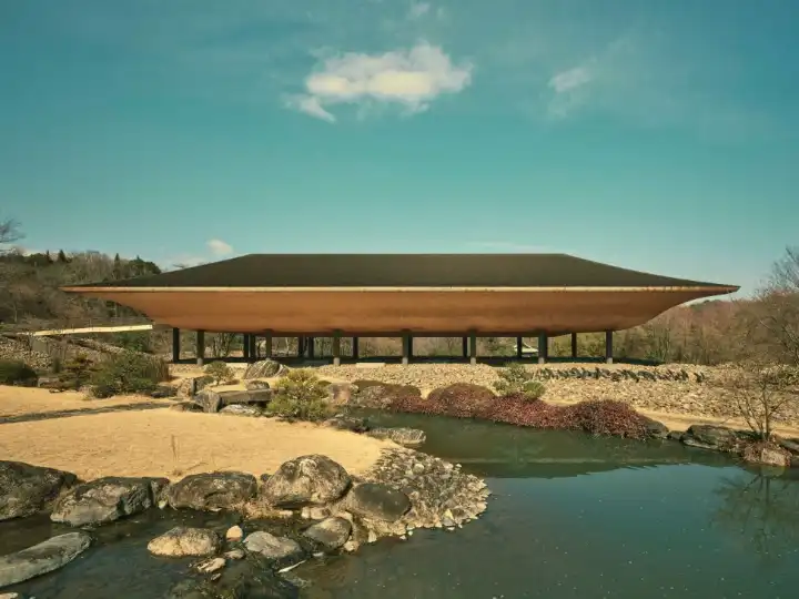 Nothing quite prepares the first-time viewer for the sight of Kohtei. Set in lush green hills to the west of the Japanese city of Fukuyama, the Buddhist meditation pavilion has a mysterious air, appearing to hover above a sea of stones. That was exactly the intention of Kohei Nawa, the contemporary artist who created the design. “Kohtei was designed to resemble a ship floating in the mountains,” says Nawa, who worked on the pavilion with architects Yoshitaka Lee and Yuichi Kodai as part of an art collective, Sandwich.
