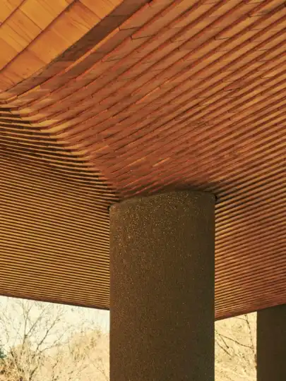 The maritime echoes were no accident. The 1960s Zen temple of Shinshoji, in whose grounds Kohtei was completed in 2016, was founded by the president of Tsuneishi, a shipbuilding company based nearby. But the subject also offered a gracefulness to the project. Drafting in craftsmen from the area, Nawa and the two architects had 590,000 pieces of Sawara cypress layered on top of each other using a traditional roofing technique calledkokera-buki. In spite of the building’s size, stretching to some 45 metres in length, the delicate wooden shingles give the hull-like structure a sense of lightness.