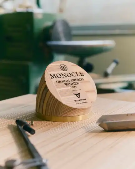 Harry Thaler has crafted the trophy for the Monocle Design Awards since its debut in 2021, working with the Tscherms-based workshop of Martin Klotz to refine its curved timber form. For the 2025 iteration, Thaler opted for plywood as the primary material, reflecting human ingenuity; the laminating of several layers of timber veneer make a product that is lighter than solid wood. The trophy, which can be used as a paperweight, is a testament to thoughtful design that is celebrated by these awards, which this year are supported by Cupra Design House.