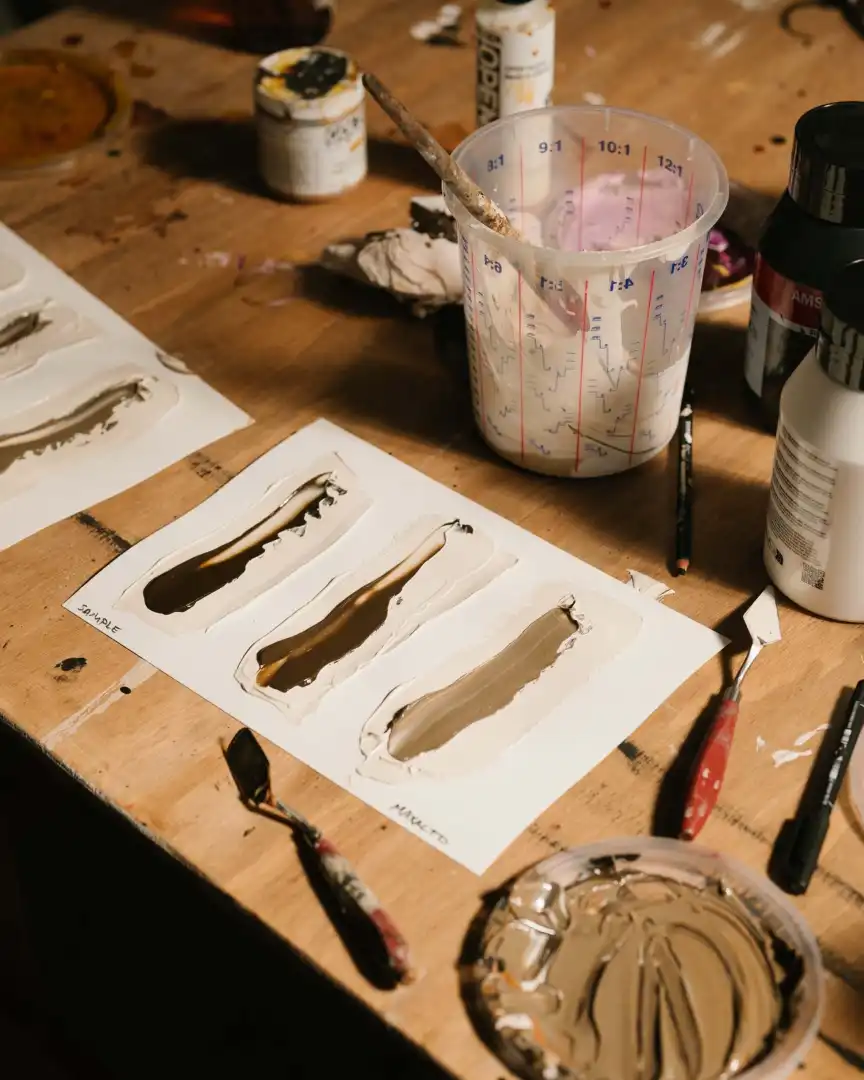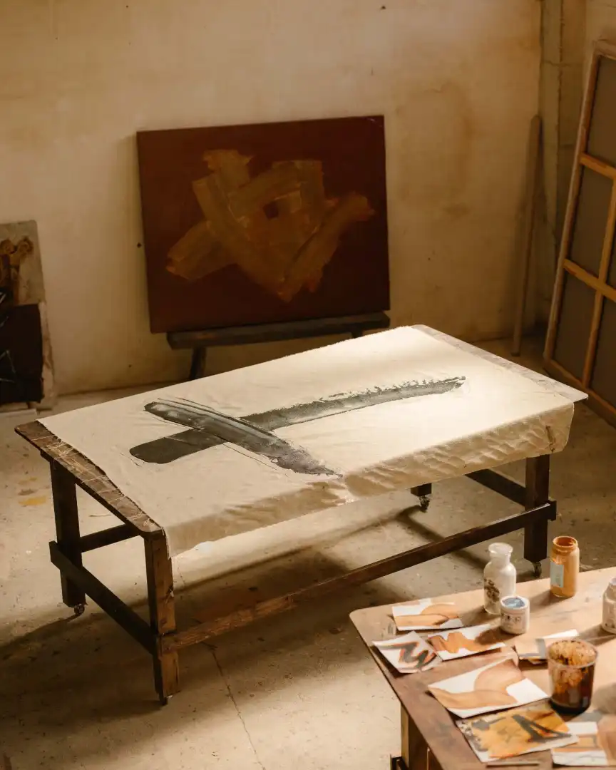 And so, Van Riemsdijk did; first he draped pieces of fabric over a Lilum Dormeuse to hone his approach before finally painting broad strokes across a couch. Colour development was key. “At first I considered black but it felt too harsh,” says Van Riemsdijk. “Maxalto has a lot of earthy tones, so I shifted to a dark brown that contrasts well with the beige fabric.” The final painted daybed was then transported back to Italy, where it was used to develop a fabric that replicated the colour and stroke-weight of this base model, which has been applied to the pieces.