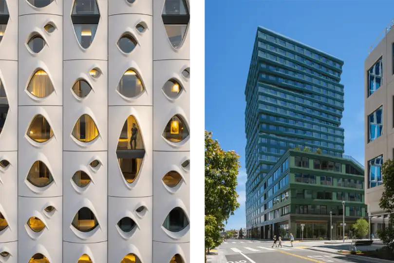 The aspen-inspired Populus hotel (on left) and the Verde residential tower.(Image: Jason O’Rear)