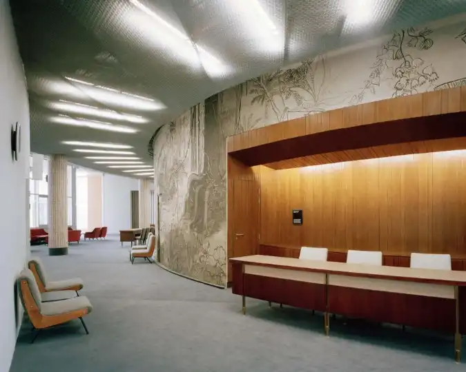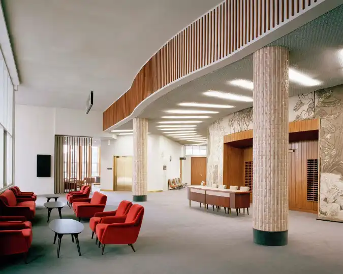 A mosaic artwork depicting fearsome African fauna, which was removed soon after the building was opened, was also recreated using archival drawings and photographs. Meanwhile, 500 pieces of bespoke modernist furniture, designed by Mezzèdimi, were spruced up and returned to their intended positions. “From the cafeteria to the rotunda, every space had a designed furniture piece and a specific colour palette,” says Wolde. “It’s very difficult to find a building these days with integrated artwork, let alone on this scale.”