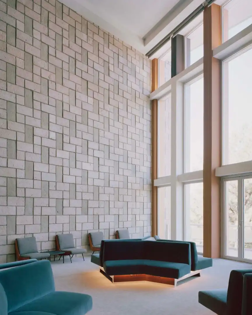 Any additional box-ticking was concerned with preserving the space as much as possible, even if that required painstakingly producing like-for-like replacements of features that were deteriorating. The mosaic tiles on the exterior of the building had to be removed to address structural degradation, so 13 million new ones were fabricated using the original ceramic material and replicating their textured profile and brown, orange and off-white colour scheme. The building’s entire façade was then reglazed to improve its energy efficiency and structural integrity, while the landscape garden, and its fountains, garden beds and integrated stairs, were completely refreshed and reinstalled.
