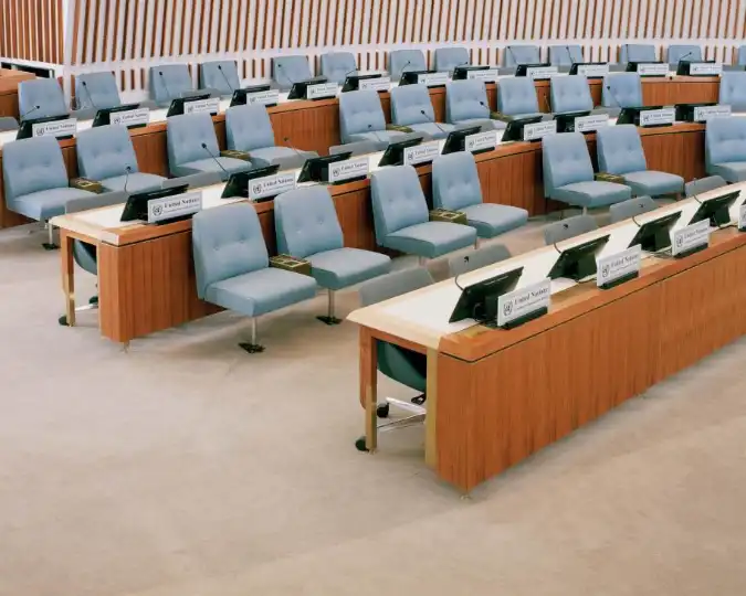 When the building’s horseshoe-shaped plenary hall was built, 26 African countries were represented in the ECA. By 2011 this number had risen to 54. As a result, Mezzèdimi’s original wooden seating had to be sacrificed. “We designed new joinery using these old architectural drawings,” says Boundy. “This meant that we were able to make something contemporary that could house audiovisual conferencing and voting systems, while also ticking the box for accessibility.”