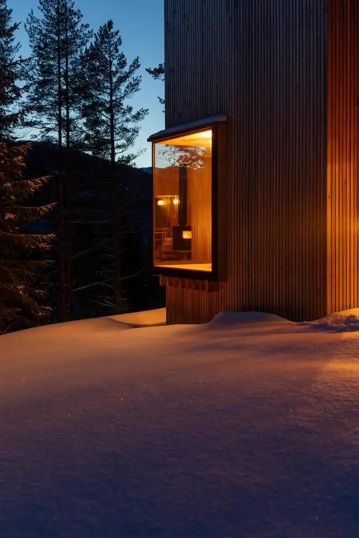 The colour, material and windows have helped thishytteto blend into the landscape but Lenschow didn’t want to completely disguise the building, so he opted for a straightforward geometric design. “It wasn’t about coming up with clever shapes to camouflage the house,” says the architect. “I like it when a building is proudly a work of architecture but still resonates with the setting.”