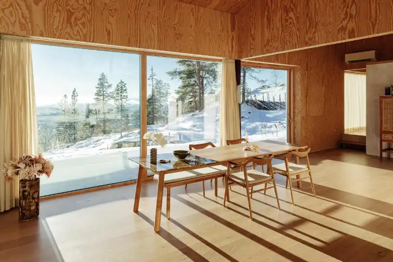 It’s an approach that also allowed the architects to explore how traditional architectural vernaculars, such as theårestue, can be reimagined for modern living. “Traditionally, this type of cabin is quite dark and enclosed, a place to retreat to after a long day outdoors,” says Larsen. “We wanted to preserve some traditional elements while also being innovative.”