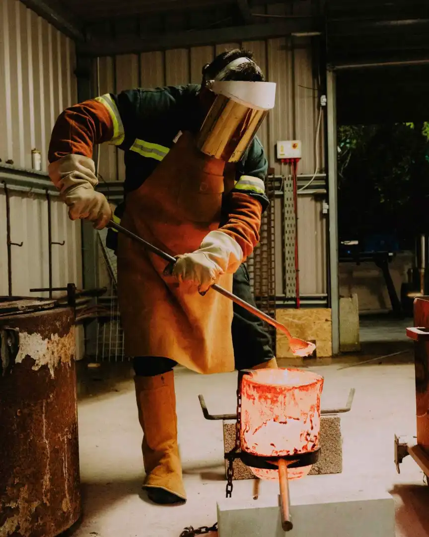 There are also makers further afield. In Cork, a four-hour drive south of Newry, father and son Mick and Darragh Wilkins are part of a crew of makers who have been essential to Orior’s recent evolution. The duo are artisans in the truest sense of the word – they don’t have a website and rely on word of mouth. They work in a former farmstead in Kilnaglery, where they run a small bronze foundry out of an A-framed barn.