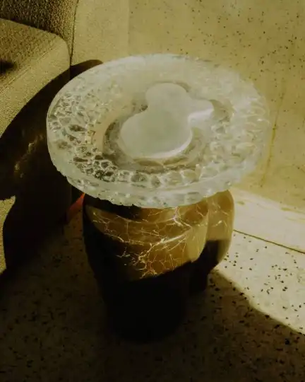 Turner, a colourful character who studied fine art and worked as a fisherman, marches around the studio he shares with his wife, Lorraine, as he shows us around. For Orior he makes the Easca and Corca tabletops using recycled Irish crystal that gets melted down, reformed and fired in a huge kiln. “It has unique air bubbles in it,” says Turner, running his hands over the Easca’s surface, which has a resin-like feel to it.