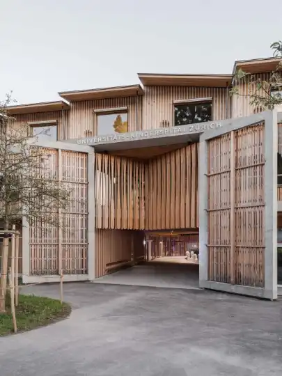 In a residential district on the outskirts of Switzerland’s biggest city is the newly opened University Children’s Hospital Zürich. Among the site’s high-rise buildings and classically inspired, stone-clad medical- research facilities, the building stands out – not just because of its atypically low height but also as a result of its timber and concrete exterior. Nicknamed Kispi, it was designed by Swiss architecture firm Herzog&de Meuron as an alternative to sterile medical facilities.
